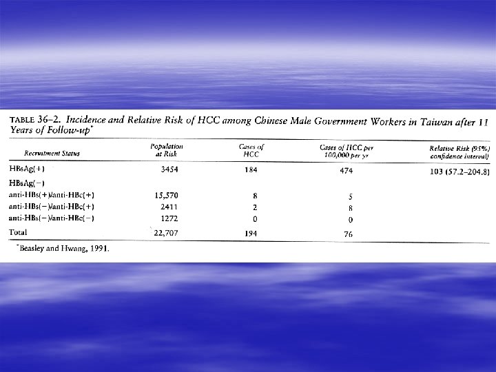 Taixing City, PRC Population-Based Case-Control Study: The relationship between liver cirrhosis and liver cancer Liver cirrhosis Case N % Control N % No 149(86. 6) 355(99. 2) Yes 23 (13. 4) 3 (0. 8) Crude OR (95%CI) Adjusted OR (95% CI) 18. 3(5. 40~61. 8) 22. 1(6. 11~79. 9)