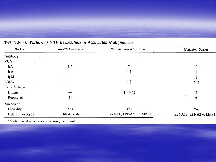 Epstein-Barr Virus § § § Enveloped DNA virus Infects >90% of the population worldwide Transmitted by salivary exchange Infects both epithelial and B cells Associated with Burkitt’s lymphoma, Nasopharyngeal cancer (NPC), and lymphomas in immunocompromised patients § Mechanism of carcinogenesis: latent membrane protein 1 (LMP 1) located in host cell membrane – Lymphocytes: Inhibits apoptosis – Epithelial cells: Activates expression of (1) epidermal growth factor receptor and (2) antiapoptotic factor A 20