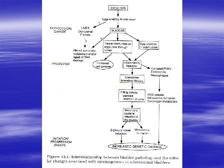 Schistosomiasis § Over 200 million infected worldwide § Infection occurs through contact with water containing cercariae § Eggs elicit a chronic inflammatory response § Different species associated with different cancers – Schistosoma haematobium and urinary bladder cancer (10, 600 bladder cancer cases [3%] attributable to S. haematobium in 2002) – S. japonicum and colorectal cancer