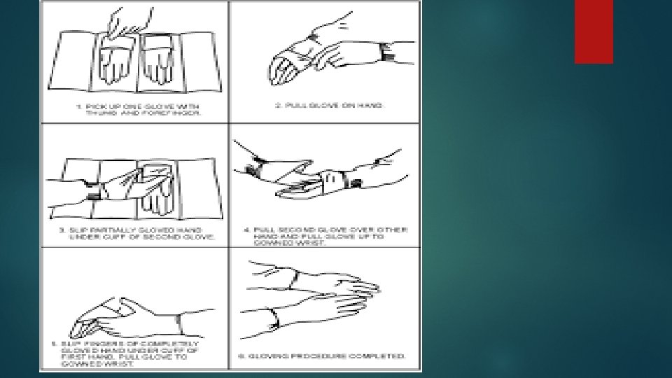 2. Gloving: a) Pick up one glove with thumb and forefinger. b) pull glove on hand. c) slip partially gloved hand under the cuff of second glove. d) pull second glove over other hand pull glove up to gloved wrist. e) slipping fingers of completely gloved hand under cuff of first hand. Pull glove to glove the wrist.