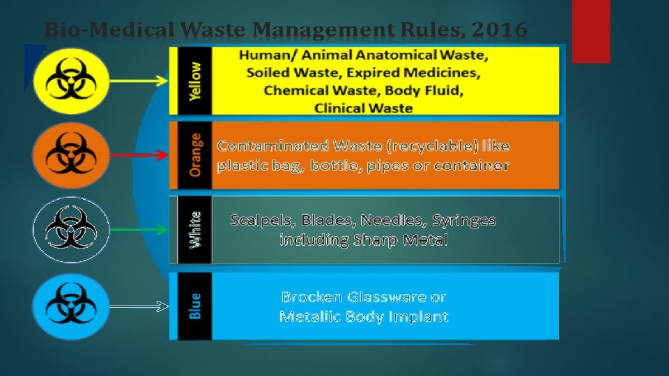 Waste Sharps eg: Needles Human anatomical waste Discarded medicines Solid waste eg: cotton swabs