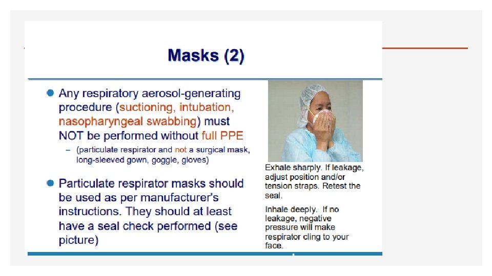 Airborne precautions for aerosol-generating procedures Some aerosol-generating procedures have been associated with an increased risk of transmission of coronaviruses (SARS-Co. V and MERS-Co. V), such as tracheal intubation, non-invasive ventilation, tracheotomy, cardiopulmonary resuscitation, manual ventilation before intubation, and bronchoscopy. P Procedures only in an adequately ventilated room using full PPE ( N 95 mask) that is, natural ventilation with air flow of at least 160 L/s per patient or in negative pressure rooms with at least 12 air changes per hour and controlled direction of air flow when using mechanical ventilation use eye protection (i. e. , goggles or a face shield), wear a clean, non-sterile, long-sleeved gown and gloves. If gowns are not fluid resistant, HCWs should use a waterproof apron for Infection prevention and control during health care when novel coronavirus (n. Co. V) infection is suspected Limit the number of persons present in the room to the absolute minimum required for the patient’s care and support.