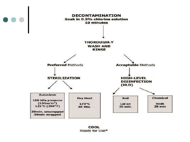 l l Process instruments , and other items after use by first decontaminating and thoroughly cleaning them, then either sterilizing or high level disinfecting them using the recommended procedures. Protect workers , through offering relevant immunizations