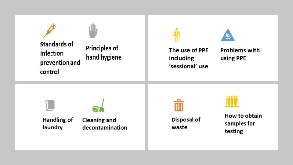 Top tips for trainers • All colleges need to complete the training. - it may be helpful to monitor where certain members of staff go throughout the shift to identify ‘hot spots’ of staff. • It may take more than one teaching session for a person to grasp the full donning and doffing. • All trainers are to be supernumerary to act as PPE Champions, don’t be afraid to challenge incorrect practices. • Praise good practice , its important to keep moral up.