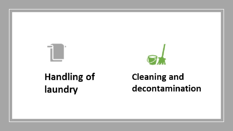 Cleaning • Ensure cleaning staff know what PPE they should wear in each area • Train cleaning staff in putting on & taking off PPE • Clean all surfaces in resident rooms (especially high touch areas such as grab rails, bedrails, bathrooms) • Discard cleaning solution at a disposal point (Clean mop handle & bucket) • Remove waste and linen for disposal/reprocessing • Remove PPE and wash hands