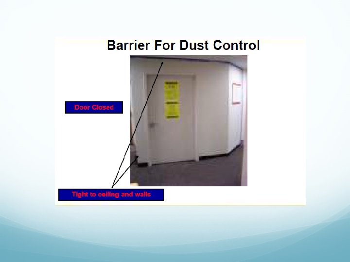Documented Source of Spores in Construction Settings False ceilings Insulating material Fire-proofing material Open windows/doors Contaminated carpeting Dust from construction site • Dust from excavation site