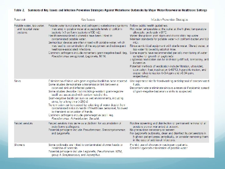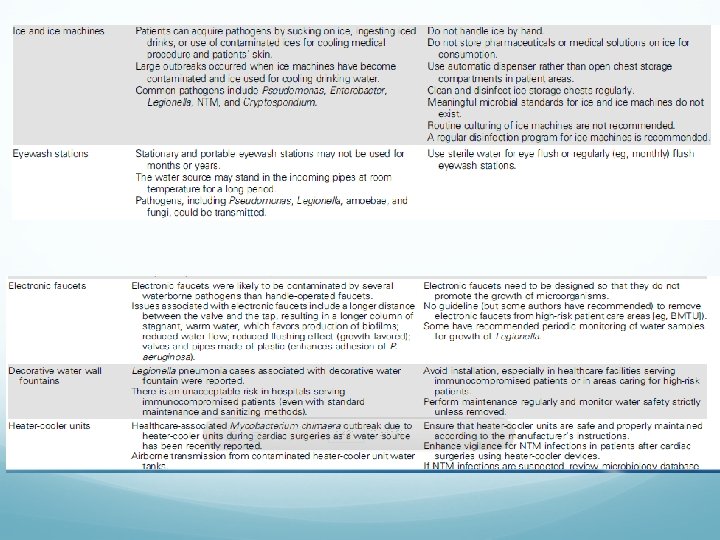 Other Issues Install alcohol-based hand-rub dispensers at the bedside and in other accessible locations to increase hand-washing compliance and reduce contact transmission of infection. Select easy-to-clean floor, wall, and furniture coverings, and employ proper cleaning and disinfection procedures. Design and maintain the water system at the proper temperature and adequate pressure; minimize stagnation and back flow; eliminate dead- end pipes; regularly clean point-of-use fixtures; and consider the location of decorative fountains and carefully maintain them to minimize the risk of waterborne infection. Provide single-bed rooms with private toilets to enable separation or isolation of patients on admission, so that those with unrecognized infections can be tested and identified without being mixed in with uninflected individuals