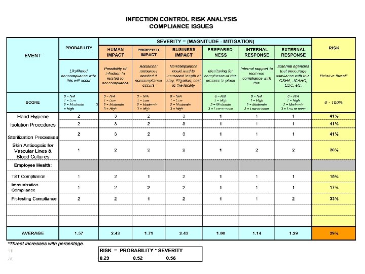 Review • A risk assessment is used to identify your facility’s risk of infections. • The risk assessment forms the framework for the Infection Prevention and Control Plan • The assessment and plan should be reviewed annually and any time there is a change in conditions / risk. • The template presented is a simple tool for performing a risk assessment.