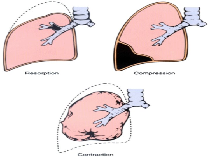 Four types: 1. Resorption atelectasis (obstructive): Due to obstruction of airways that prevent the air from reaching distal airways, then the air already present in these airways beyond the obstruction will gradually absorbed ……… alveolar collapse.