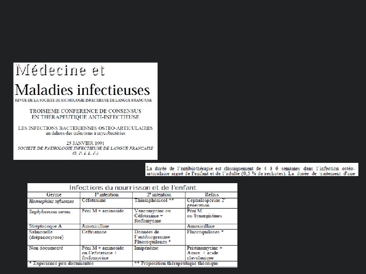 TRAITEMENT • Quelles molécules relais per os? – Pristinamycine? Ng J et al. J antimicrob Chemother 2005; 55: 1008 -12 – Clindamycine? Kingella kingae R – Amoxicilline- acide clavulanique Todd et al. Drugs 1990; 39: 264 -307 – C 1 G/C 2 G (Céfazoline/Céfamandole)