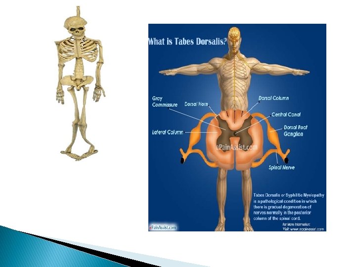 Neurosyphilis � About 10% of tertiary syphilis. � It causes: 1. Meningosyphilis: characterized by involvement of the meninges by gumma or the typical syphilitic vascular changes. 2. Tabes dorsalis: characterized by degeneration of the posterior roots and posterior column of the spinal cord. 3. General paralysis of insane: characterized by encephalitis with motor & sensory dysfunction + psychiatric symptoms.