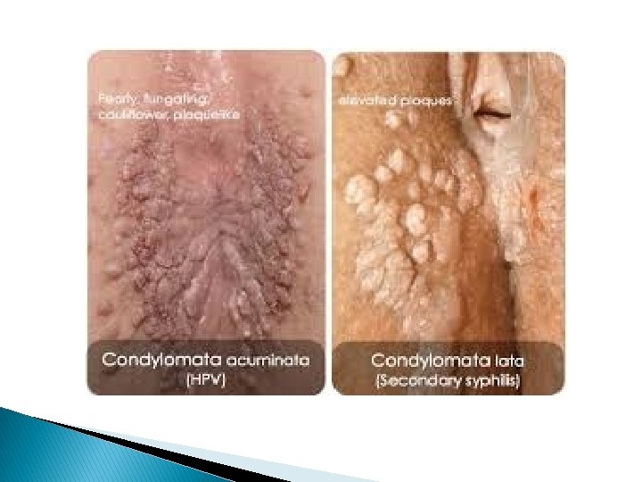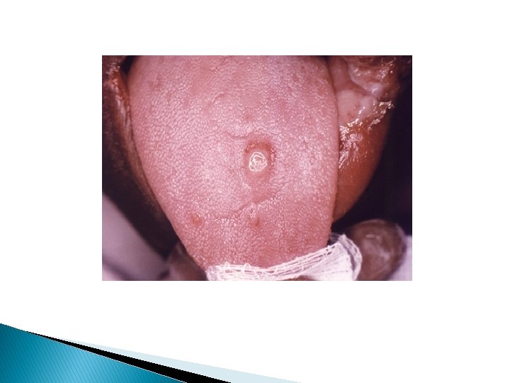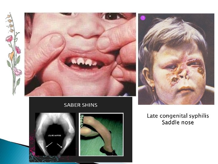 Congenital syphilis � Usually occurs when the mother has primary or secondary syphilis. Mode of transmission: transplacental or trans-vaginaly during birth. � Manifestation of the disease are : � Intrauterine or perinatal death (in 50% of untreated cases). Early (infantile) congenital syphilis: occurs in children between 0 and 2 years old, includes nasal discharge (snuffles), rash with skin sloughing, hepatomegaly, Diffuse lung or liver fibrosis can also occur. Late manifestations it occurs in children at or greater than 2 years of age Notched central incisors known as Hutchinson's teeth saddle nose (collapse of the bony part of nose) Deafness from auditory nerve disease Saber shin is a malformation of the tibia. It presents as a sharp anterior bowing inflammation of the cornea known as interstitial keratitis leading to blindness.