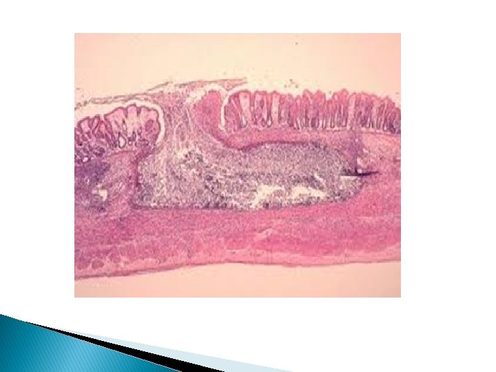 Intestinal Amoebiais � � Mode of transmission: Contaminated food and water WITH FRESH STOOL contain the Entamoeba histolytica cyst � Flask shape ulcer in the colon caused by the trophozoite of parasites. � Mic. : Mucosal necrosis, invasion of the submucosa & spread laterally. � Diagnosis: GSE (general stool exam)……to see the trophozoite in case of active disease, or the cyst in healthy carrier. � � Clinically: Fever &diarrhea. � Complications: Perforation & peritonitis.