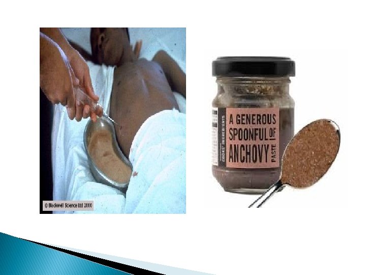 Hepatic Amoebisis � Passage of the trophozoite from the colon to the liver via the portal vein will cause Amoebic liver abscess. � Grossly: The abscess is pale , shaggy with necrotic rim and contains red-brown thick fluid composed of dead hepatocytes+ blood+ fibrin…. . giving the characteristic Anchovy sauce � Clinically : Fever, hepatosplenomegaly, high WBC titer. � Complications: � Rupture of the abscess to the: Peritoneum, Pleura, Pericardium.