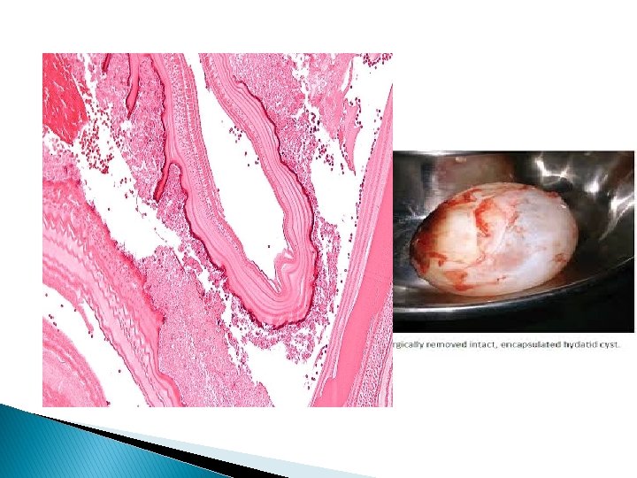 Hydatid cyst Cause: Echinococcus Granulosus. Man is considered as the intermediate host, dog is the final host having the adult worm & shed the eggs onto the grass or green plants, the eggs will be ingested by man which will hatch and pass from the intestine through the portal system to the liver and other organs. About two thirds of human E. granulosus cysts are found in the liver, 5% to 15% in the lung, and the rest in bones and brain or other organs � Histopathology of hydatid cyst: The cyst is composed of: 1. Outer fibrous capsule. Acellular white laminated layer. Thin cellular (germinal) layer which give rise to scolices. 2. 3.