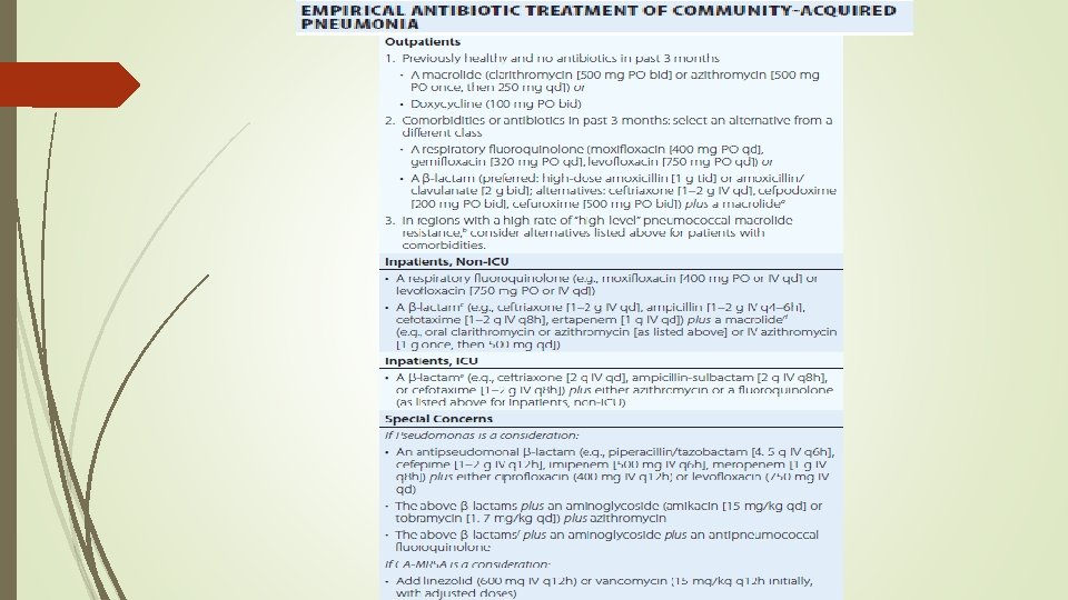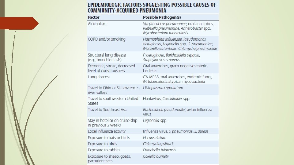 Pneumonia An infection of the pulmonary parenchyma Previously classified as community-acquired (CAP), hospital-acquired (HAP), or ventilatorassociated (VAP) Recently, CAP and health care–associated pneumonia (HCAP) CURB-65 criteria for prognosis and determining hospital admission: confusion (C); urea >7 mmol/L (U); respiratory rate ≥ 30/min (R); blood pressure, systolic ≤ 90 mm. Hg or diastolic ≤ 60 mm. Hg (B); and age ≥ 65 years