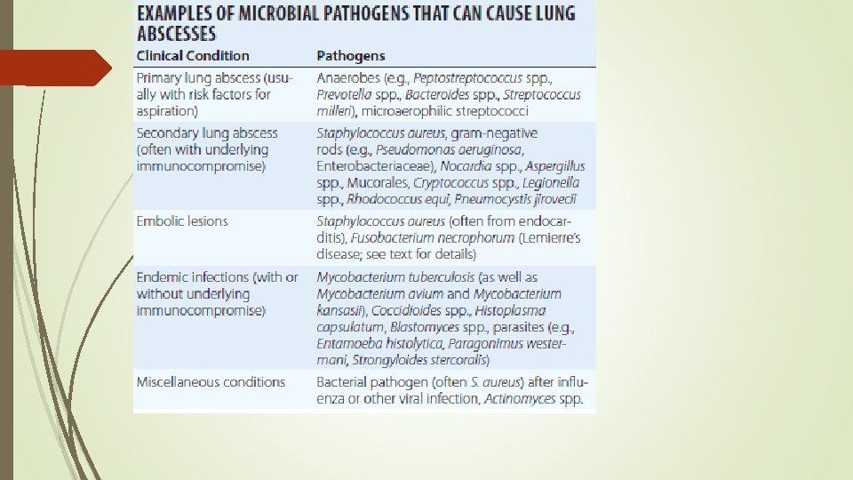 Lung Abscess A necrosis and cavitation of the lung following microbial infection Characterized as either primary (~80% of cases) or secondary Can be acute (<4– 6 weeks in duration) or chronic (~40% of cases)