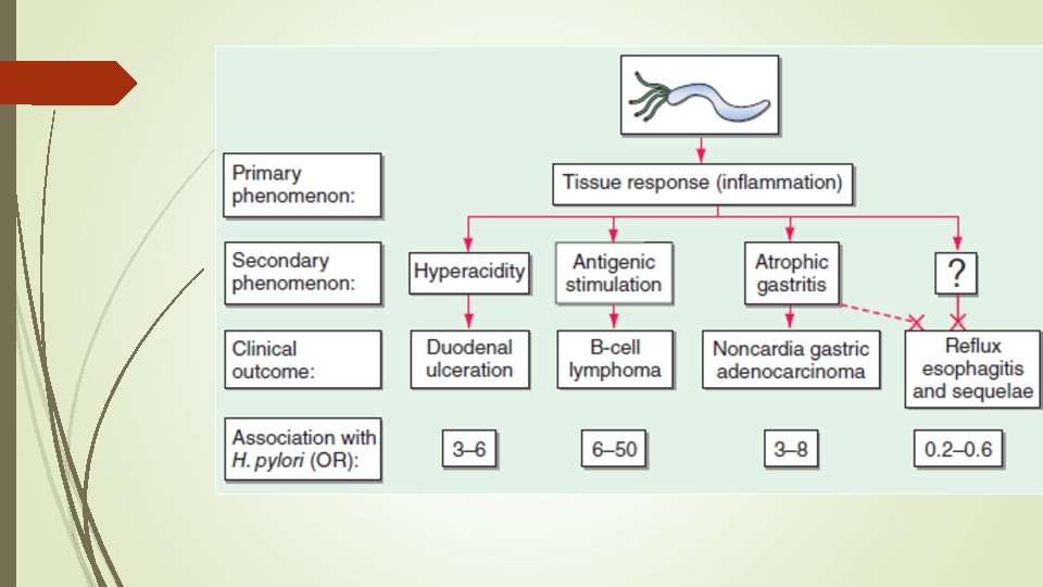HELICOBACTER It colonizes the stomach in ~50% of the world’s human population, essentially for life unless eradicated by antibiotic treatment Humans are the only important reservoir Lifelong colonization may offer some protection against complications of gastroesophageal reflux disease (GERD), including esophageal adenocarcinoma Treatment against the organism prevent/treat PUD and low-grade gastric MALT lymphoma, however, no benefit in the treatment of gastric adenocarcinoma Nongastric (intestinal) Helicobacter species can cause clinical features resembling those of Campylobacter infections Prevalence varies with age: H. pylori is usually acquired in childhood, The age association is due mostly to a birth-cohort effect Combination of factors lead to disease state: bacterial strain differences, host susceptibility to disease, and environmental factors