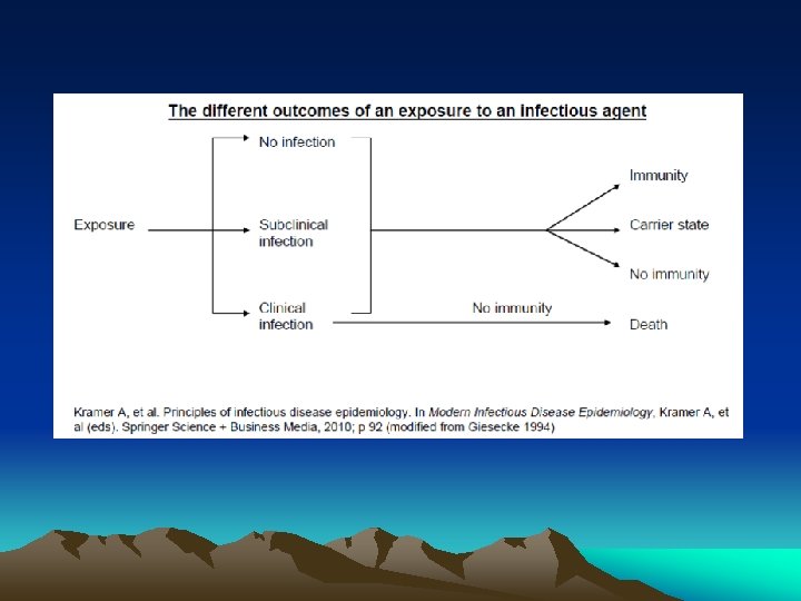 CLINICAL RESPONSES TO INFECTION BY AN AGENT • Inapparent infection – no clinical symptoms generated • Carrier state – usually no clinical symptoms but host can transmit infection for long periods • Clinical symptoms – Mild disease – Severe disease – Residual impairment – death