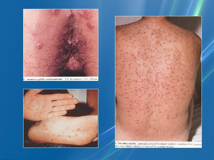 2. Sifilis Sekunder • • 6 -8 minggu stlh SI Lamanya sampai 1 th Gejala konstitusi ringan Kel. kulit great imitator - Roseola - Papul skuamosa, psoriasiform, kondiloma lata - Pustula • Mukosa - Angina sifilitika eritematosa, kondiloma lata - Plaque muqueuses • Rambut: alopesia areata/difusa • Kuku: onikia sifilitika