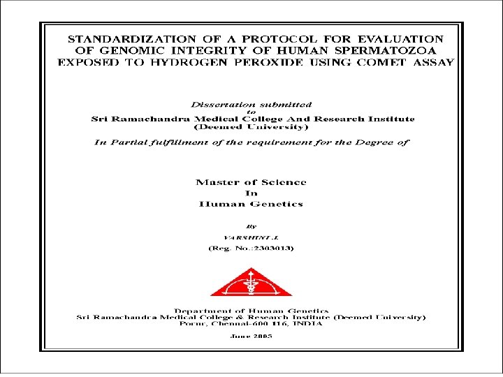 CONCLUSION n An in vitro assay with human spermatozoa - valuable sensitive system - assess potential genetic effects - various factors in human reproduction n Need for assessment further intensified - genetic disorders transmitted through ART’s n The comet assay - promising tool - evaluation - genetic aspects of male infertility