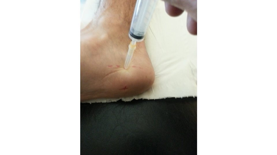 Repérer par une palpation profonde au doigt la zone douloureuse exquise de la voute plantaire. La marquer au stylo. Repérer le bord inférieur du calcanéum à la face interne du pied à la limite entre la peau du pied et la peau cornée de la voûte plantaire. Aiguille verte ou orange. 1 ml introduite verticalement jusqu’au contact de la zone douloureuse exquise inférieure.