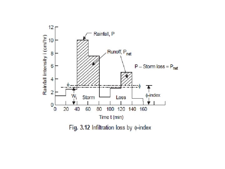 Infiltration Procedure for determination of the index 1. Draw the hyetograph of the storm rainfall and compute the total volume of rainfall. 2. Compute the excess runoff volume from the storm hydrograph by separating the base flow from it. 3. Subtract (2) from (1) to determine the total intake of rainwater into the soil.
