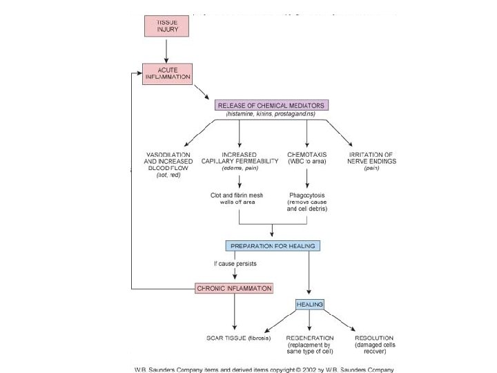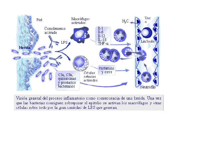 Patógeno Material inorgánico Agresión física DAÑO TISULAR Proteasas plasmáticas Mediadores lipídicos Péptidos Citoquinas proinflamatorias NEUTROFILOS Células endoteliales plaquetas linfocitos Macrófagos MATERIAL EXTRAÑO ELIMINADO? si RESOLUCIÓN reparación tisular no INFLAMACIÓN CRÓNICA apoptósis citoquinas antiinflamatorias angiogenesis granuloma