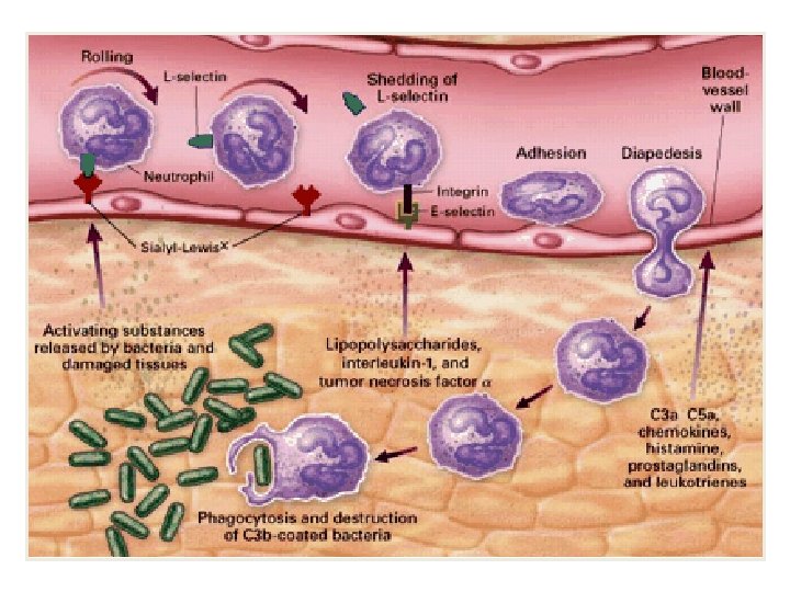 c) ACTIVACIÓN Y RECLUTAMIENTO DE NEUTRÓFILOS 1. 2. 3. 4. • MARGINACIÓN DE LEUCOCITOS ROLLING (rodar) ADHESION (PAVIMENTACION) MIGRACION DE: – NEUTROFILOS (1 -2 DAYS) – MONOCITOS (2 -3 DAYS) 5. QUIMIOTAXIS – MOLECULAS DE SEÑAL ENDOGENAS - LINFOQUINAS – TOXINAS EXOGENAS 6. FAGOCITOSIS – ENZIMAS LISOSOMALES, RADICALES LIBRES.