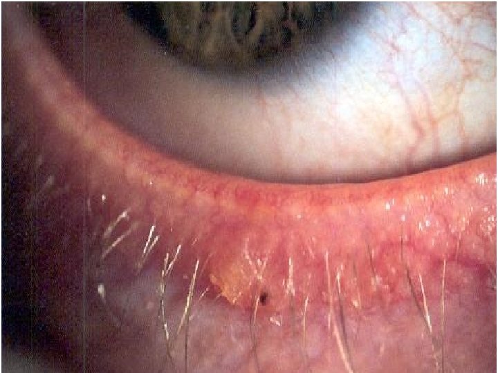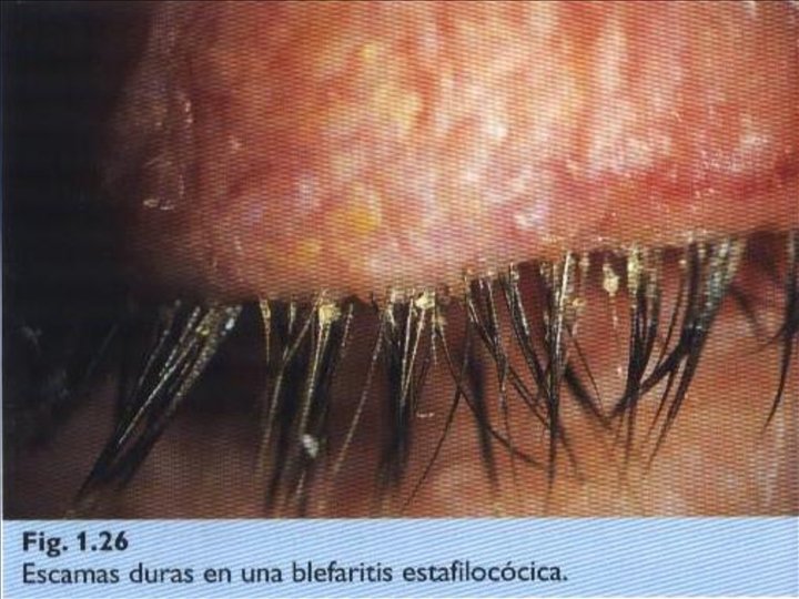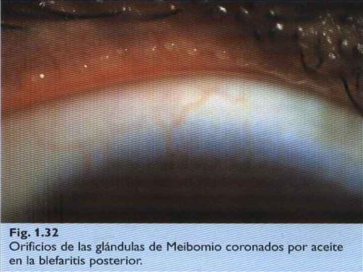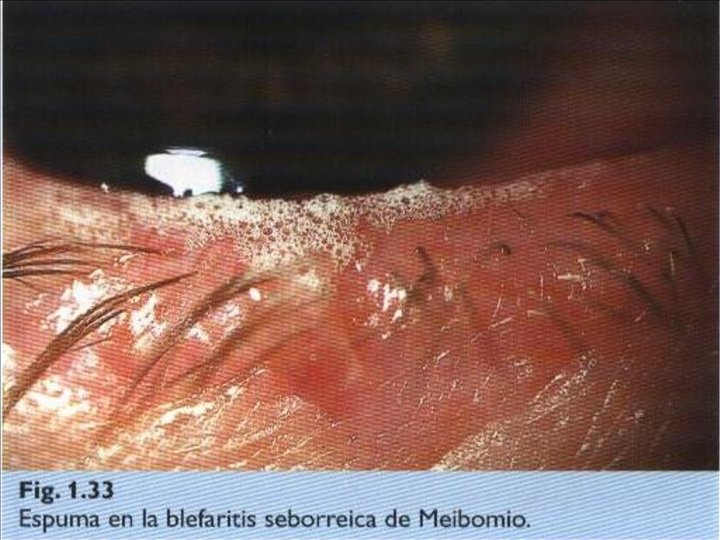 Blefaritis: Concepto: Estado inflamatorio crónico del borde libre palpebral. Clasificación : * Anterior : Estafilocóccica * Posterior : Meibomitis * Mixta Cuadro clínico : Hiperemia y telangiectasia de los bordes palpebrales escamas duras alrededor de las bases de las pestañas escamas blandas y grasosas en las pestañas y borde palpebral. secreción excesiva de las glàndulas de meibomio