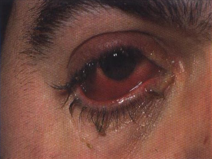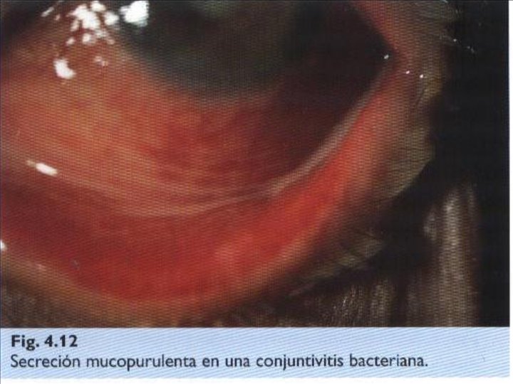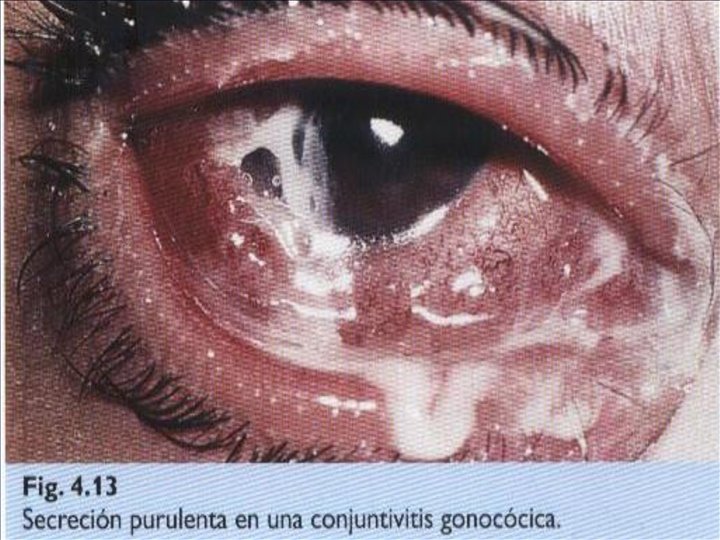 Conjuntivitis purulenta ó gonocócica; Agente etiológico: Neisseria gonorrhoeae Síntomas y signos: Igual que la catarral pero más intensos, los párpados llegan a ser tan edematosos que imposibilita abrirlos. Existe dolor ocular con síntomas generales de fiebre, astenia, infarto del ganglio pre-auricular. La secreción es purulenta y tan abundante que fluye constantemente de los párpados.
