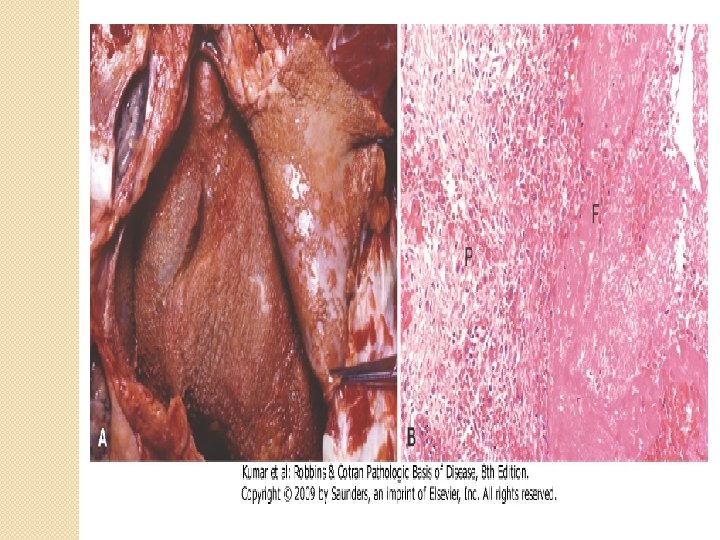 The large amount of fibrin in an exudate can form a fibrinous exudate on body cavity surfaces. Here, the pericardial cavity has been opened to reveal a fibrinous