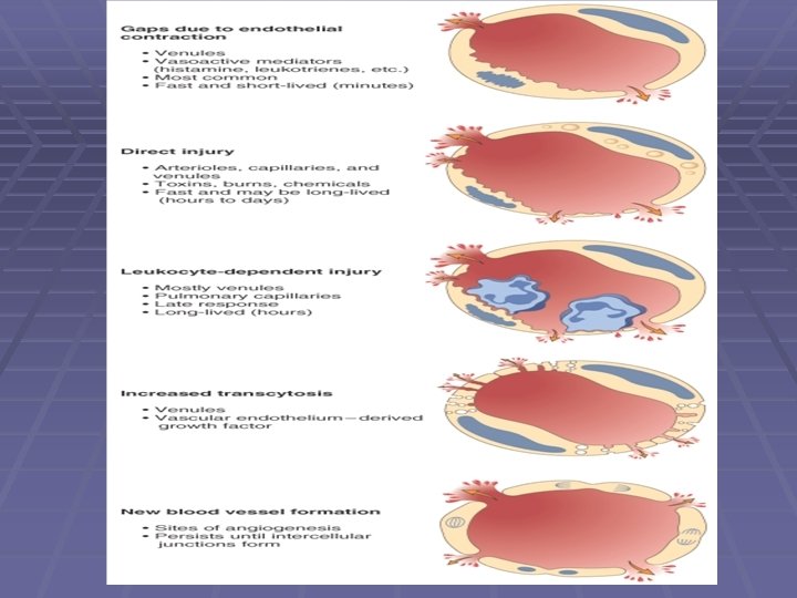 Mechanisms responsible for increased vascular permeability § Contraction of endothelial cells resulting in increased interendothelial spaces is elicited by histamine and other chemical mediators § Endothelial injury, resulting in endothelial cell necrosis and detachment. § Transcytosis Increased transport of fluids and proteins, through the endothelial cell.