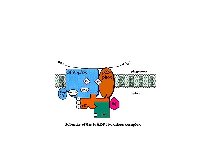REACTIVE OXYGEN SPECIES • OXIDASES CAN PRODUCE ROS, e. g: SUPEROXIDE ANION. • OXIDASE CONSISTS OF 7 PROTEINS!! • COMPONENTS IN PLASMA MEMBRANE AND CYTOPLASM. • ROS PRODUCED IN PHAGOLYSOSOMES.