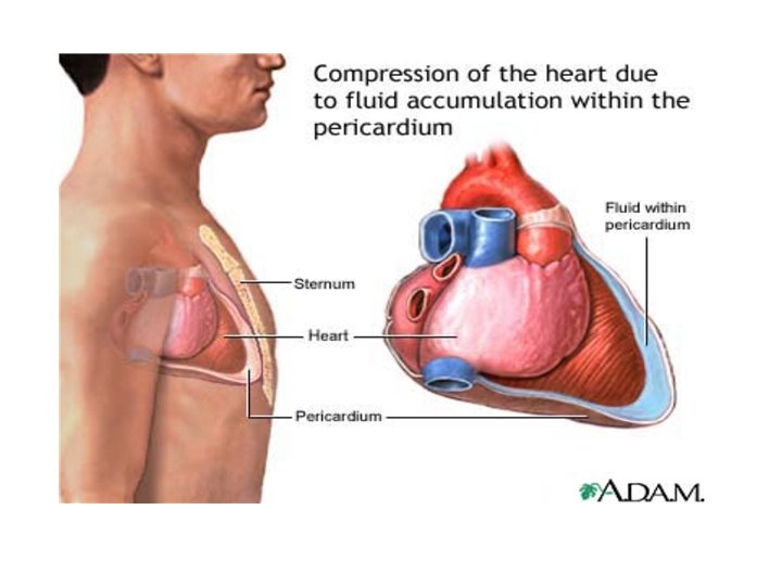 Cardiac Tamponade �compression of the heart caused by blood or fluid accumulation in the space between the myocardium and the pericardium prevents the ventricles from expanding fully, so they cannot adequately fill or pump blood �CO & signs of CHF