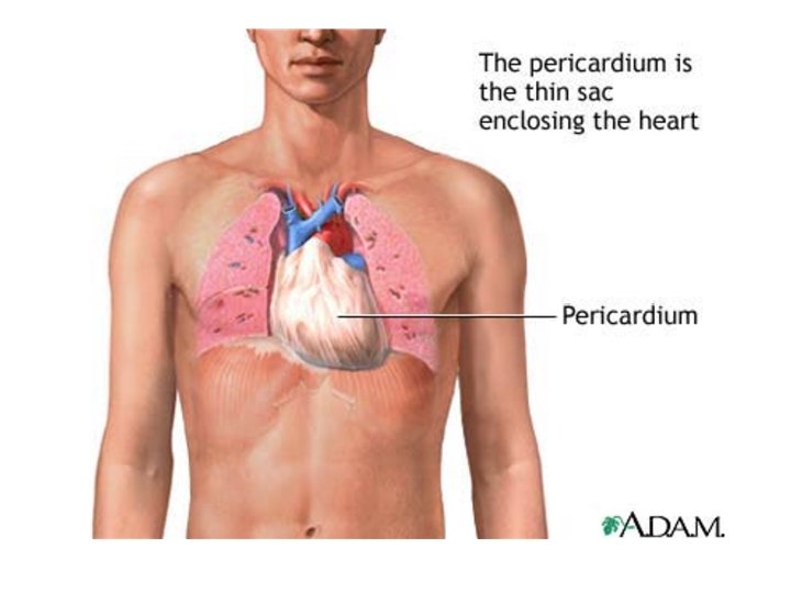 Diagnostic tests �Chest x-ray �Echocardiogram �Chest MRI or CT scan �show enlargement of the heart from fluid collection in the pericardium, and signs of inflammation. They may also show scarring and contracture of the pericardium (constrictive pericarditis) �ECG is abnormal in 90% of pts. w/ acute pericarditis. �may mimic the ECG changes of MI. To rule out heart attack, serial cardiac marker levels (CK -MB and troponin I) may be ordered �Blood culture �CBC, may show increased WBC count �Pericardiocentesis, with chemical analysis and pericardial fluid Culture