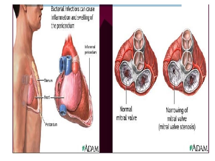 Interventions: �bed rest, low Na+ diet – �cardiac workload, promote healing �Digitalis (digoxin) – �myocardial contractility, �HR, to prevent heart failure �Diuretics – to control pulmonary or systemic congestion �Antibiotics, anti-inflammatory drugs, steroids Bacterial Endocarditis �infection of the inner lining of the heart (endocardium) caused by direct invasion of bacteria or other organisms leading to deformity of the valve leaflets