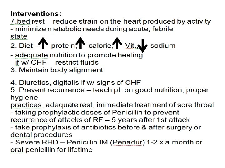 Medical Interventions 1. Identify the infectious organism - serial blood cultures 2. Destroy the infectious org. , stop the growth of valvular vegetations �IV Antibiotics 4 -6 weeks (Penicillin, Aminoglycosides) - to ensure high blood levels of medication - to eradicate the bacteria from the chambers & valves �repeated blood cultures are done to assess effectiveness of the drug 3. Surgical repair of valvular deformities and congenital defects 4. Provide nutritional supplementation & bed rest 5. Prevent relapse and recurrent fever & infection - good oral hygiene, avoid invasive procedures as possible prophylactic antibiotic therapy, aseptic technique