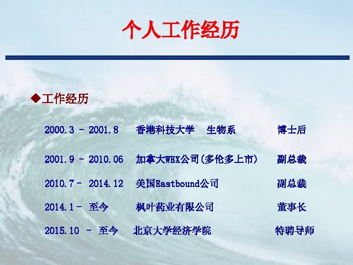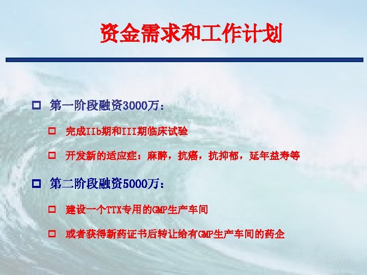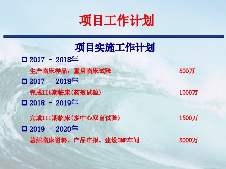 主要技术管理团队 Dr. Anh Ho Regulatory affairs 中国SFDA Dr. Leo Lin CMC(林维扬) 加拿大 Health Canada BGTD Dr. Patrick du Souich Pharmacologic 美国FDA Dr. Barry Osborne Toxicity Dr. Edward Sellers Ventana Clinical Research Corp. 欧洲EMEA Covance Monitor