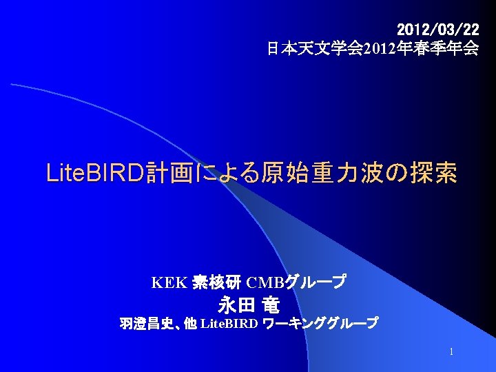 Inflation and primordial gravitational wave background 原始重力波の検出がもたらす 極初期宇宙の知見 ・Inflation の energy scale ・Inflaton field の変動幅 large field vs. small field model http: //wmap. gsfc. nasa. gov/ 2