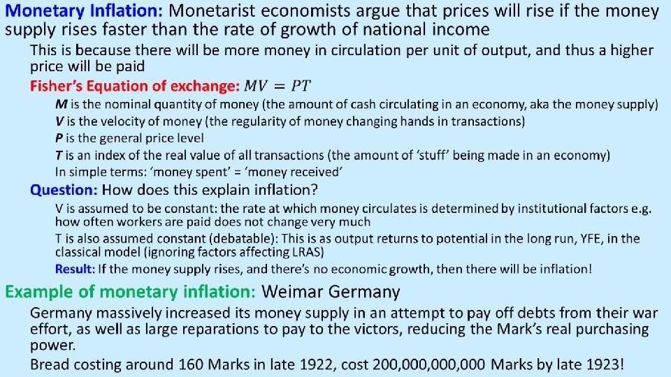 Costs of Inflation Erodes value of savings/fixed incomes: With higher prices, a given amount of money buys less output N. B. Conversely, inflation benefits borrowers as the real value of their debt falls Fall in exports: Domestic goods become less price competitive so our exports fall Worsening CA deficit/balance of trade Increased uncertainty: With inflation the real values of incomes and profits are uncertain Firms and households will cautiously reduce investment and consumption Income distribution issues: Those unable to bargain over pay will be relatively worse off Distorted price mechanism: Markets work best when prices rise and fall, providing information about relative values But if average prices rise continuously, resource allocation can be distorted Is a price rise a sign of higher demand for a good? Or is it just inflation? Menu costs: Cost of updating prices. There is cost to firms in changing labels, updating fixed capital (e. g. vending machines), reissuing price lists etc. Shoe-Leather costs: There is a time cost to consumers in shopping around for the best prices, as well as transferring money between accounts to ensure that inflation is not eroding its value Psychological and Political costs: Price rises are unpopular and people may feel worse off, even if their wage rises by the same amount.