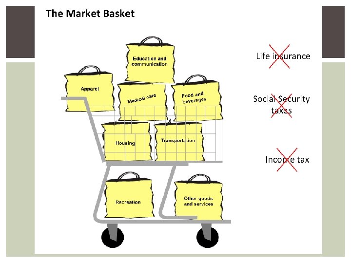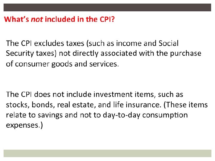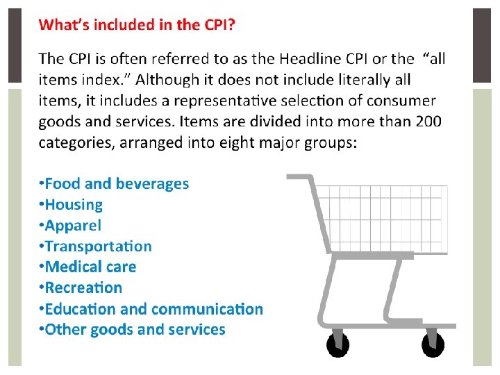 HOW IS INFLATION MEASURED Consumer Price Index (CPI) § Used to measure consumer inflation § Market basket approach (typical basket of goods and services) § Quick, efficient § Ignores consumer substitution, quality changes (if quality and price go up, it doesn’t account for quality) Consumer Price Index (CPI) is computed every month and uses prices for a market basket of 80, 000 goods and services consumed by a typical family of four