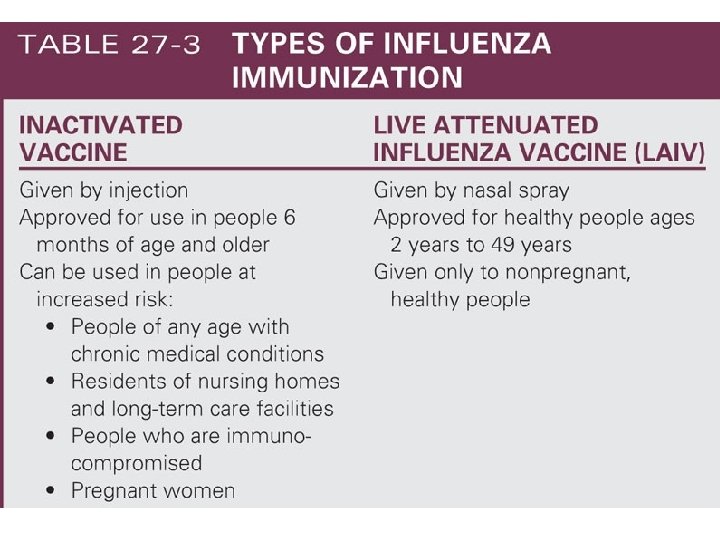 Influenza • The flu is a highly contagious respiratory illness • Affects 5 to 20% of American population annually • Flu season is September to April –Peak November to March • 20, 000 deaths annually • Vaccination of high-risk groups can prevent many of these deaths