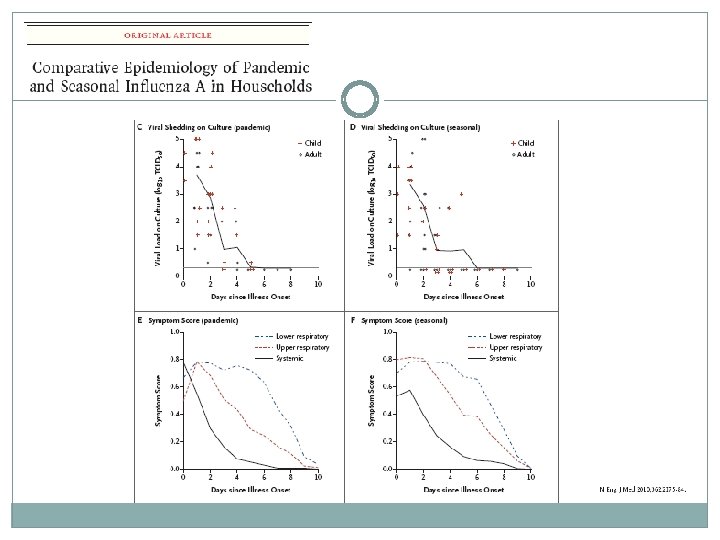 Espectro Clínico e História Natural Período de Incubação: H 1 N 1 pdm 09: 1. 4 a 4 dias. Pode ser tão curto como 1 dia e tão longo como 7 dias Sazonal: 1 a 2, 4 dias Excreção viral: 1 dia antes do inicio dos sintomas e permanece até resolução dos sintomas Média: 4 a 8, 5 dias Crianças e jovens podem passar de 10 dias Imunossuprimidos: semanas. Podem funcionar como reservatórios Punpanich W and Chotpitayasunondh T. Int J Infect Dis 2012; 16: e 714 -e 723