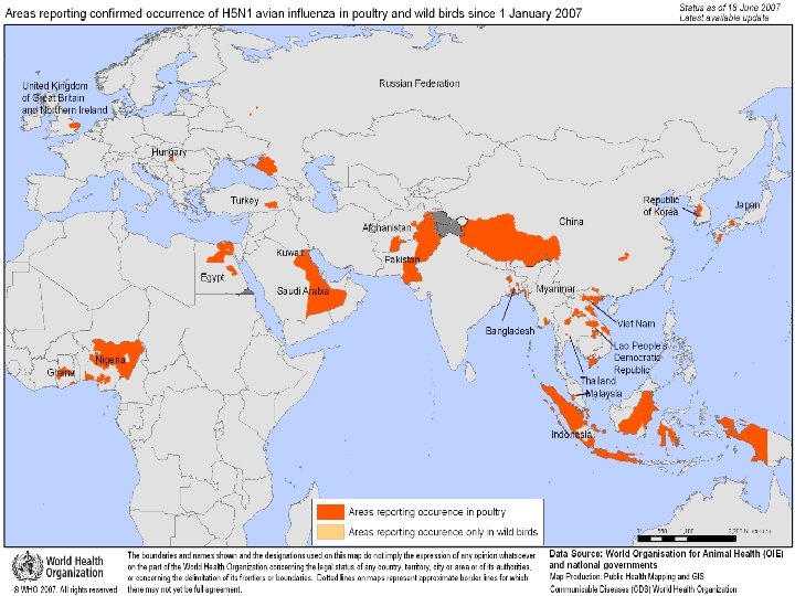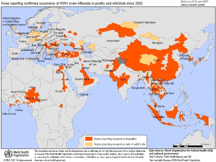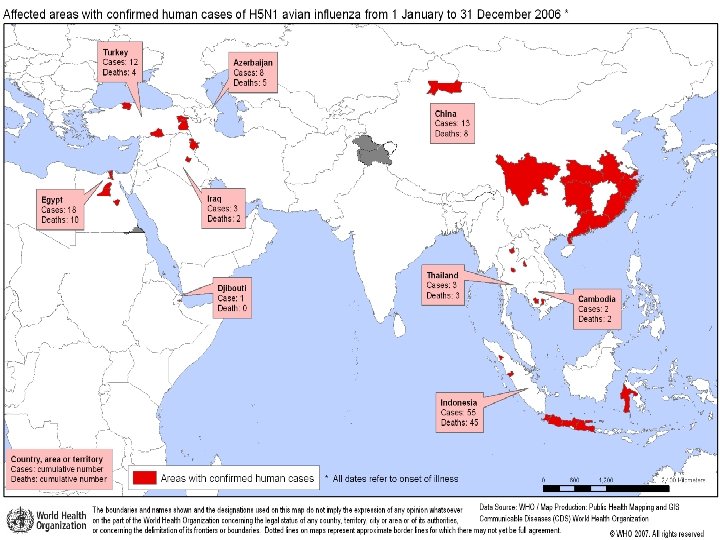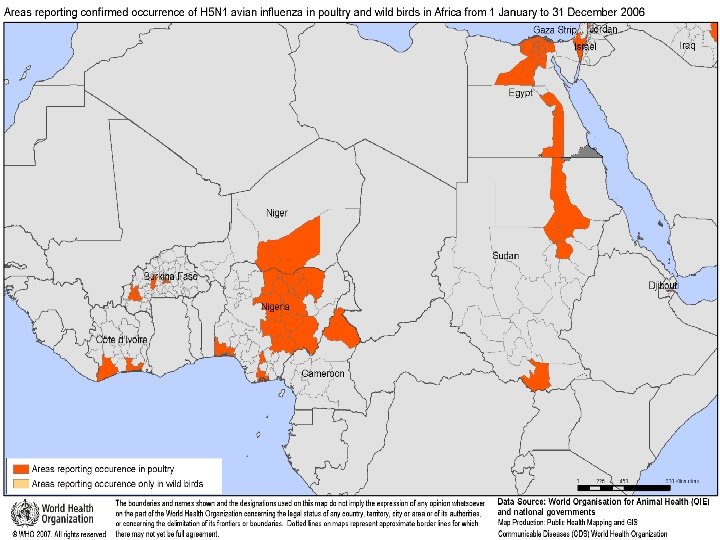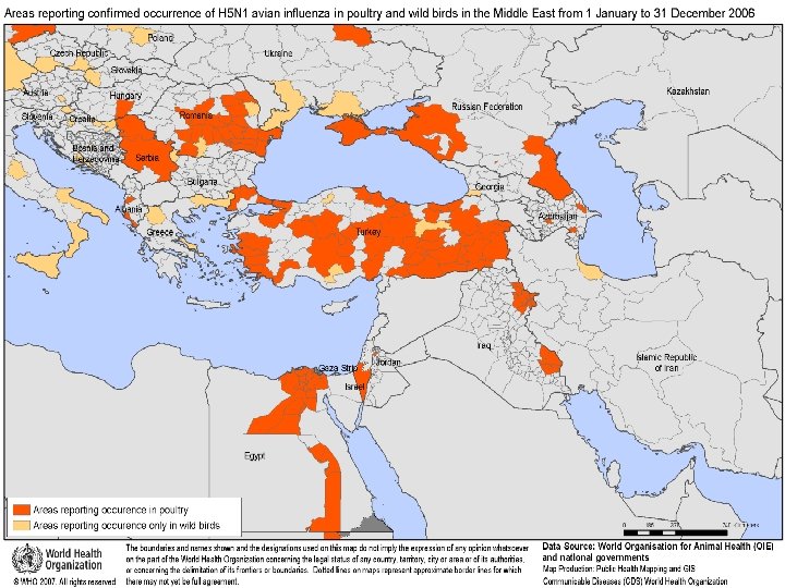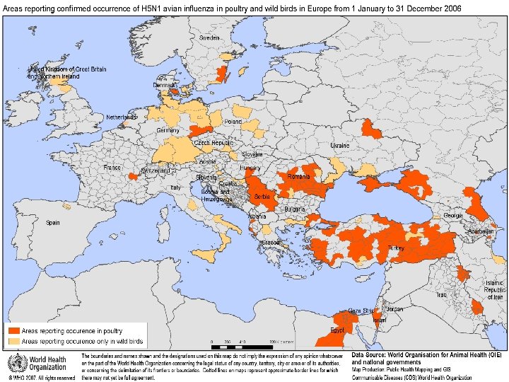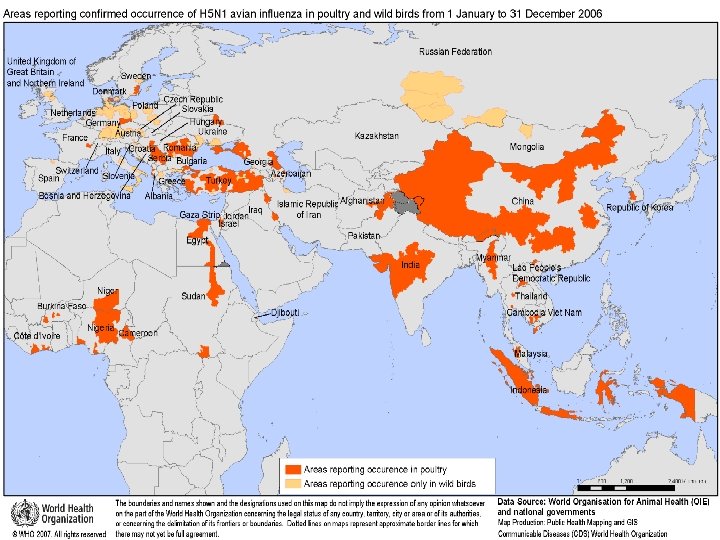Beginning in February 2006 • the geographical presence of the virus in birds expanded again, • This time dramatically: between then and early April 2006, 32 countries, located in Africa, Asia, Europe and the Middle East, had reported their first cases of infection in wild or domestic birds, or both. ﻣﺮکﺰ ﻣﺪیﺮیﺖ ﺑیﻤﺎﺭیﻬﺎ ﺍﺩﺍﺭﻩ ﺑیﻤﺎﺭیﻬﺎی ﻗﺎﺑﻞ پیﺸگیﺮی ﺑﺎ ﻭﺍکﺴﻦ ﻭﺍﺣﺪ آﻨﻔﻠﻮآﻨﺰﺍ