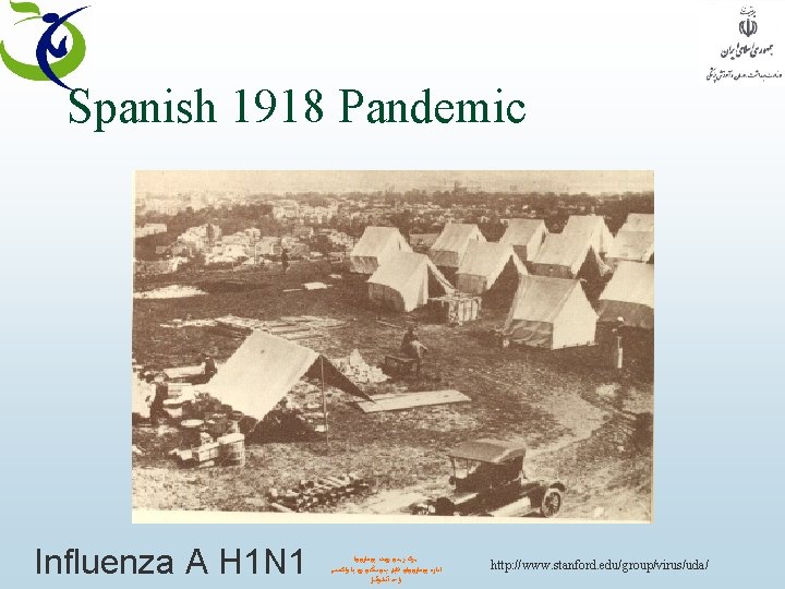 Spanish Influenza 1918 • By the fall, hospitals were overwhelmed with patients, many of whom were dying 23 days after exhibiting symptoms. • The pandemic was extremely sudden. No one was prepared. In the US, the average life span was reduced by 10 years. • ~675, 000 American deaths. ﻣﺮکﺰ ﻣﺪیﺮیﺖ ﺑیﻤﺎﺭیﻬﺎ ﺍﺩﺍﺭﻩ ﺑیﻤﺎﺭیﻬﺎی ﻗﺎﺑﻞ پیﺸگیﺮی ﺑﺎ ﻭﺍکﺴﻦ ﻭﺍﺣﺪ آﻨﻔﻠﻮآﻨﺰﺍ