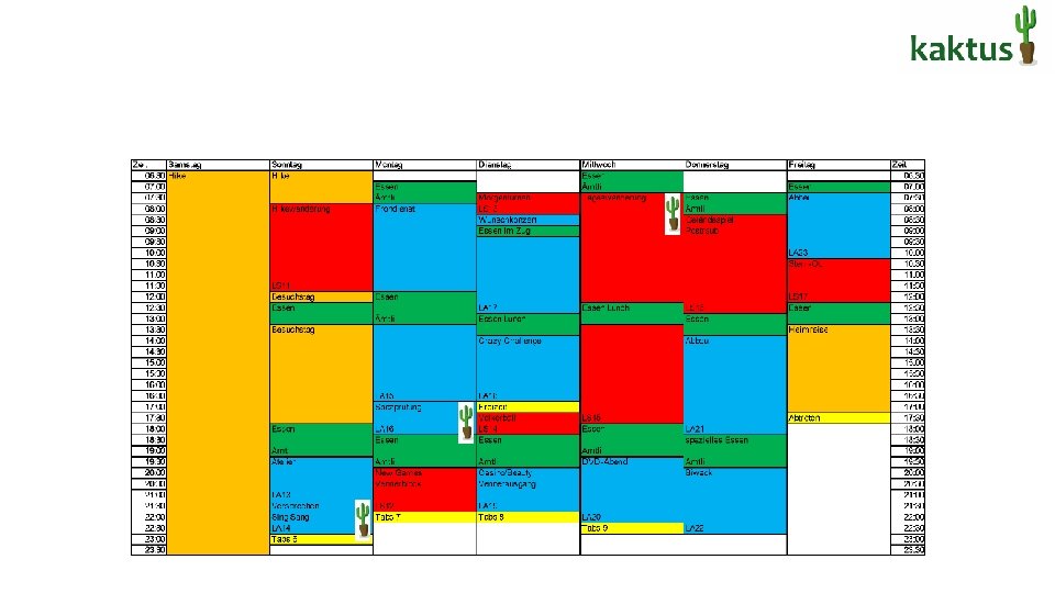 Auswertung kaktus-Lager • Anwesenheit 3⁄4 vom Leitungsteam • Wurden die Lagerregeln und Leiterregeln eingehalten? Was ha tte man besser machen ko nnen? • Was fu r Konsequenzen mussten im Lager umgesetzt werden? Aus welchem Grund mussten Konsequenzen gezogen werden? • Wie wurde die Vorbildfunktion der Leitenden im Lager wahrgenommen? Worauf ko nnte man zuku nftig besser achten? • Waren euch die Lebenskompetenzen im Lager bewusst? • Wie wurde die Lagergemeinschaft gefo rdert? • Wie hat die Umsetzung des kaktus–Blocks geklappt?