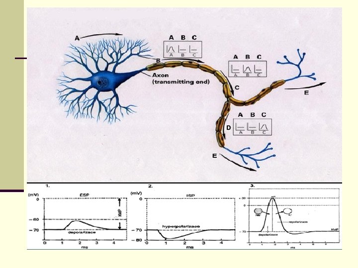 Popis obrázku n Nervové signály šířící se po neuronu jsou dvojího druhu: chemické a elektrické. Funkční spojení mezi synapsemi (nervovými zápoji) neuronů a smyslovými buňkami se uskutečňuje skrz synaptickou štěrbinu o šířce asi 20 nm vylitím neurotransmiterů (chemických mediátorů) z vezikul na nervových zakončeních (úsek E). Tato neurosekrece vyvolá na synaptické membráně následného neuronu synaptický potenciál, jehož velikost je určována množstvím vylitého neurotransmiteru. Podle povahy synaptického potenciálu rozlišujeme stav excitační – depolarizaci (1) a stav inhibiční – hyperpolarizaci (2). Synaptický potenciál se šíří od vstupní membrány neuronu do oblasti iniciálního segmentu neuronu (úsek A). Pokud zde depolarizace překročí prahovou hodnotu, vzniká elektrický akční potenciál, šířící se po úsecích axonu (B, C, D) za výměny iontů Na + (ve vzestupné fázi vstupují do axonu a působí depolarizaci) a K + (vystupují v sestupné fázi z axonu a působí repolarizaci, tj. návrat ke klidové hodnotě potenciálu KMP)