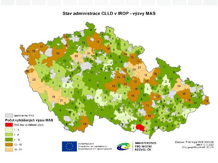 Stav administrace CLLD Celkem % vůči alokaci v SCLLD Alokace Počet zaregistrovaných Počet projektů v Počet Alokace výzev zaregistrovaných otevřených uzavřených žádostí ve realizaci s MAS (Kč) žádostí ve výzev výzvách MAS vydaným PA výzvách MAS (Kč) Alokace projektů Počet Alokace v realizaci s proplacených vydaným PA (Kč) ŽOP (Kč) 96 1 448 10 153 660 817 3 291 7 423 142 800 2 062 4 545 190 416 1 290 - - 133, 5 - 97, 6 - 59, 8 - Celkový počet vyhlášených výzev MAS 1 544 • Z toho 1 448 uzavřených výzev • Z toho 271 výzev bez předloženého projektu 2 374 619 825 31, 2