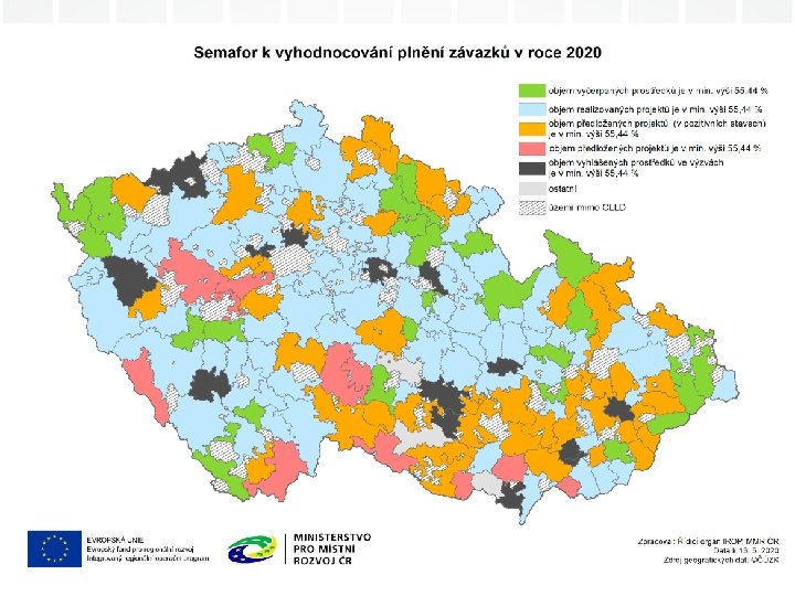 Semafor k vyhodnocování závazků IN v roce 2020 CLLD • Černá – objem vyhlášených prostředků ve výzvách je v min. výši 55, 44 % → 14 MAS • Červená – objem předložených projektů je v min. výši 55, 44 % → 11 MAS • Oranžová – objem předložených projektů (v pozitivních stavech) je v min. výši 55, 44 % → 46 MAS • Modrá – objem realizovaných projektů je v min. výši 55, 44 % → 79 MAS • Zelená – objem vyčerpaných prostředků je v min. výši 55, 44 % → 25 MAS 3 MAS nemají v tuto chvíli požadovaný objem alokace ve vyhlášených výzvách! ITI a IPRÚ • České Budějovice, Liberec - Jablonec • Praha, Brno, Ostrava, Olomouc, Hradec Králové – Pardubice, Ústí – Chomutov, Jihlava, Karlovy Vary, Mladá Boleslav, Zlín • Plzeň